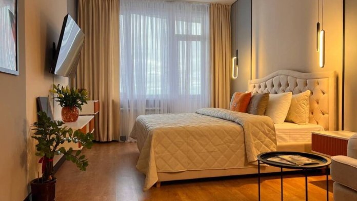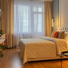 Квартира рассчитана на 4 человека, оборудована одной двуспальной кроватью (160x200 см) с удобным матрацем и двуспальным диваном (160x200 см), обеспечивающим качественный и здоровый сон. На каждую кровать и диван идет следующий комплект: 2 подушки, 2 наволочки, двуспальное одеяло, пододеяльник, простынь.