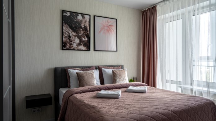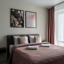 Квартира рассчитана на 4 человека, оборудована комфортной двуспальной кроватью (180x200 см) с удобным матрацем, обеспечивающим качественный и здоровый сон, а также современным двуспальным диваном (160x200 см). На каждую кровать и диван идет следующий комплект: 2 подушки, 2 наволочки, двуспальное одеяло, пододеяльник, простынь.