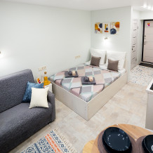 - ортопедическая двуспальная кровать (140 см) и диван (ширина 120 см, для 2 ребятишек);