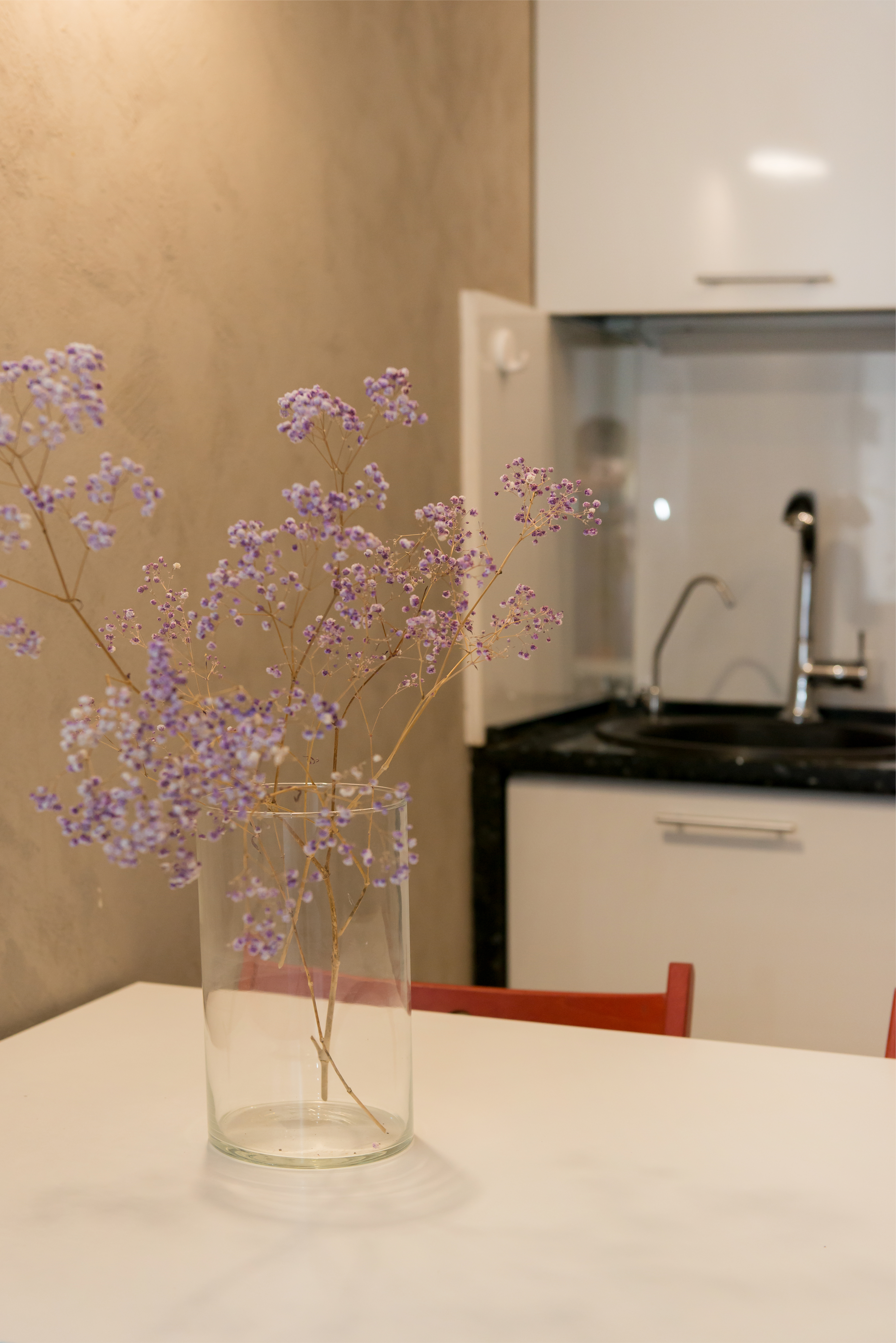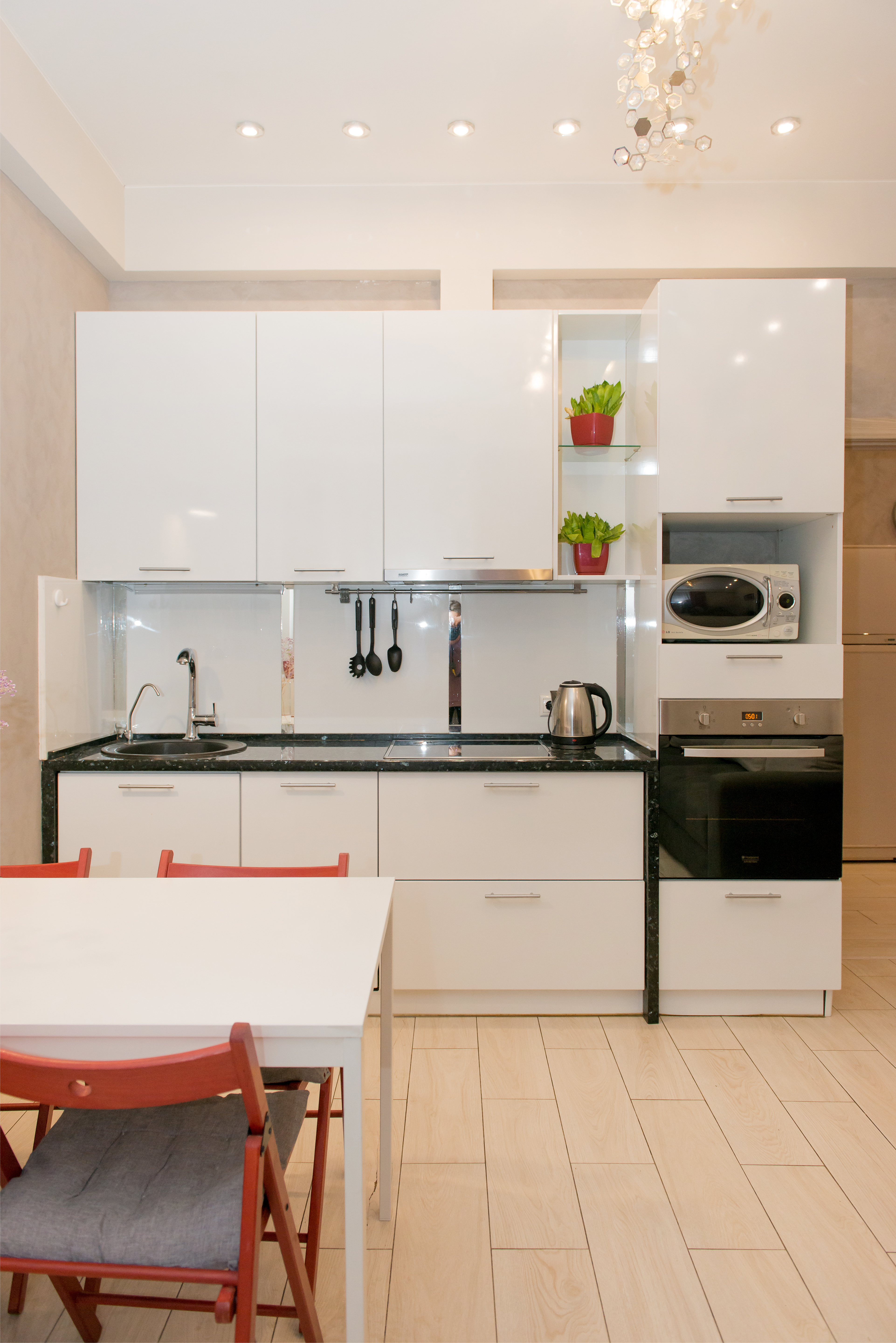 Полностью оборудованная кухонная зона (плита, чайник, посуда).
