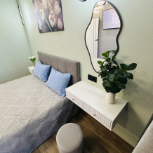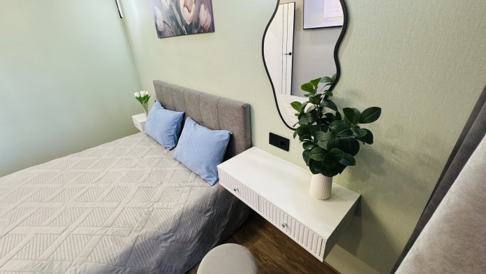 В апартаментах уборка производится перед каждым гостем. Внутри есть все для комфортного проживания: двухспальная кровать, двухспальный диван, шкаф, зеркала, большой жк телевизор smаrt tv, интернет, холодильник, стиральная машина, фен, средства гигиены, утюг, гладильная доска. Выдаем постельное белье и полотенца.