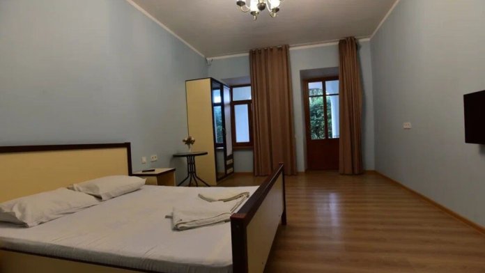 В номере: холодильник, двуспальная кровать, набор мебели, балкона нет. Удобства на этаже на 5 номеров, находится в корпусе климатопавильон.