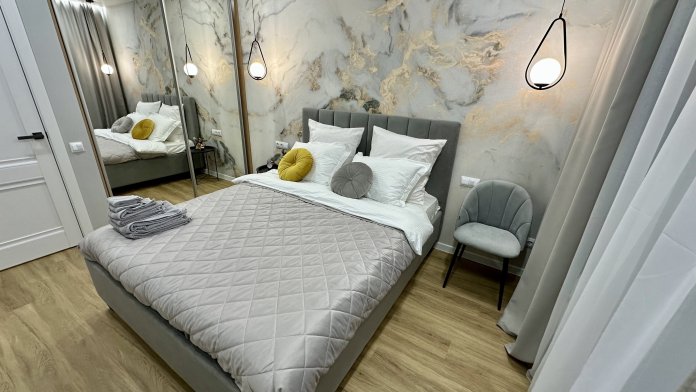 Двуспальная кровать, раскладной диван, Smart TV телевизор, Wi-Fi, электрическая плита, микроволновая печь, чайник, холодильник, вся необходимая посуда и кухонные принадлежности, стиральная машина, утюг, фен, комплект постельного белья, комплект полотенец, гигиенический набор (зубной набор, шампунь, бальзам, гель для душа, мыло, ватные диски и палочки), порошок для стирки.