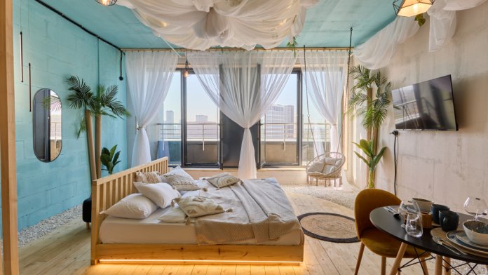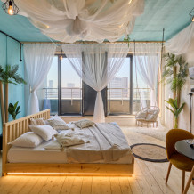 Квартира - пляж. В интерьере продумана каждая деталь, чтобы вы чувствовали себя, как на пляже. Просторная гостиная с деревянными дорожками и галечным покрытием пола, декор из ракушек и морских камней создают атмосферу настоящего тропического курорта.