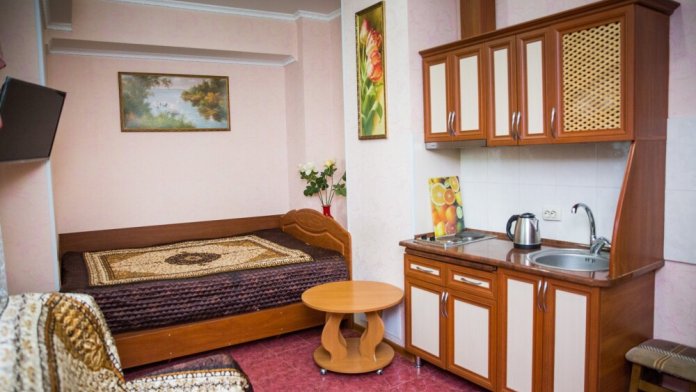 Гостевой дом представляет собой очень уютное небольшое здание с частным двором. Внутри он весь буквально утопает в зелени цветов и декоративных насаждений. Здесь же располагаются удобный гамак с козырьком, беседка с уличной пластиковой мебелью, мангал с дровяной печью, парковка и многое другое, что сделает Ваш отдых комфортным и приятным.
