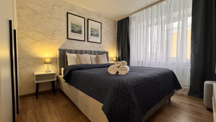 Квартира рассчитана на 6 человек, оборудована 2 комфортными двуспальными кроватями (160*200 см) с удобным матрацем, обеспечивающим качественный и здоровый сон, а так же современным диваном (160*200 см). Вас ждёт двуспальная кровать (160x200 см) с удобным матрацем и двуспальный диван (160x200 см), обеспечивающий качественный и здоровый сон. На каждую кровать и диван идет следующий комплект: 2 подушки, 2 наволочки, двуспальное одеяло, пододеяльник, простынь.