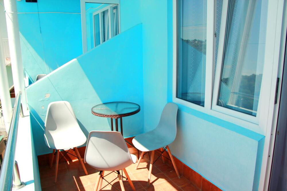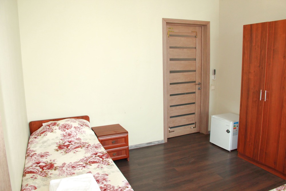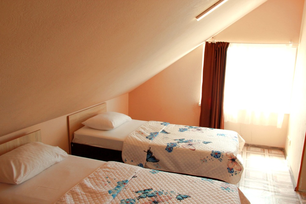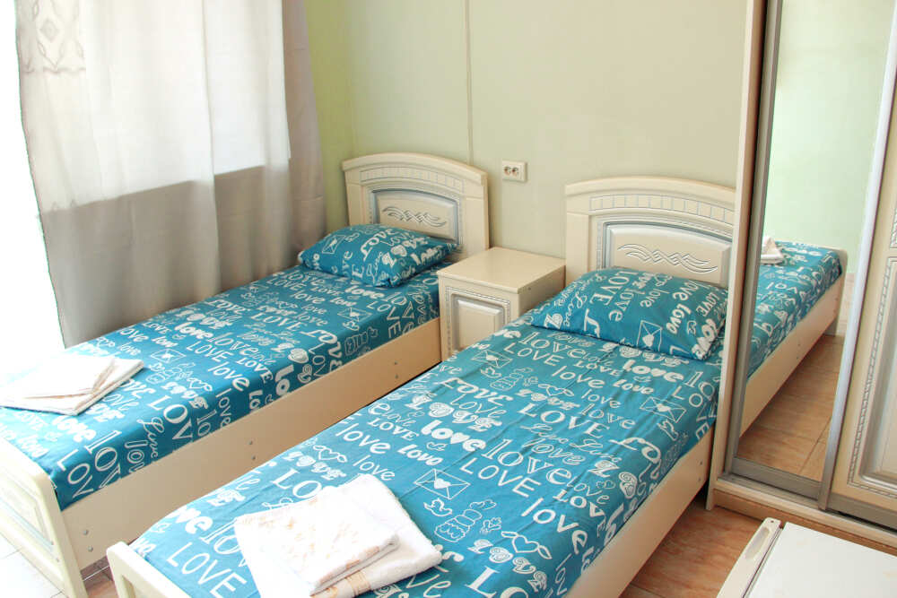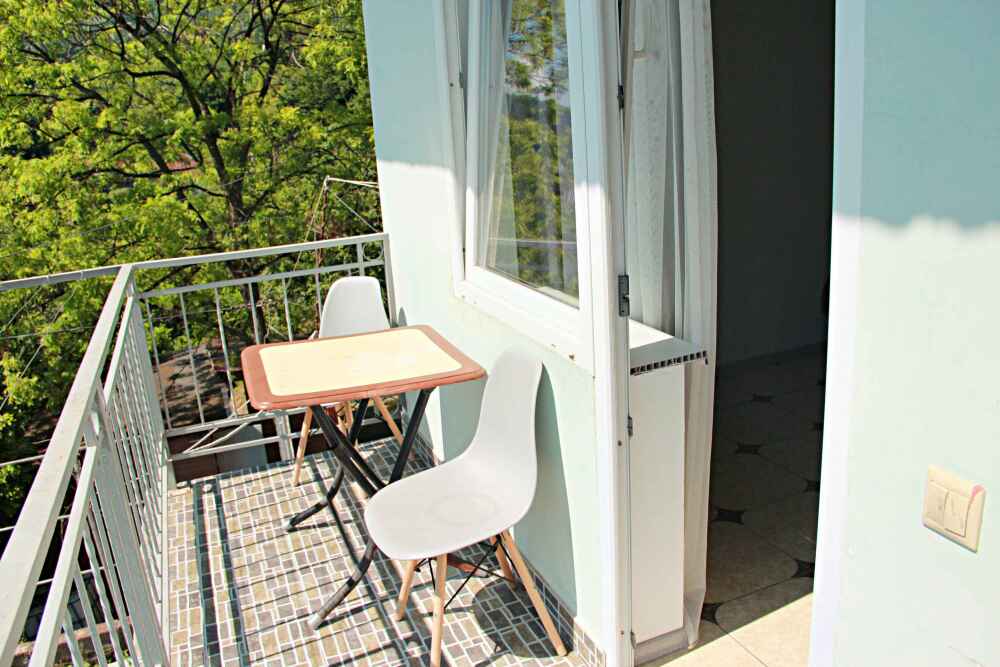 3-х местные номера категории «Эконом» с балконом - уютные однокомнатные номера, 2 этаж второго корпуса, в номере – три раздельные кровати либо 2-х спальный диван и 1-но спальная кровать, шкаф для одежды, прикроватные тумбочки, телевизор, мини-холодильник, кондиционер. В номере есть большой балкон с видом на море и внутренний двор гостевого дома. На балконе есть стол и стулья для отдыха. Санузел (ванна, туалет, умывальник) на 2 номера в коридоре рядом с номерами.