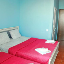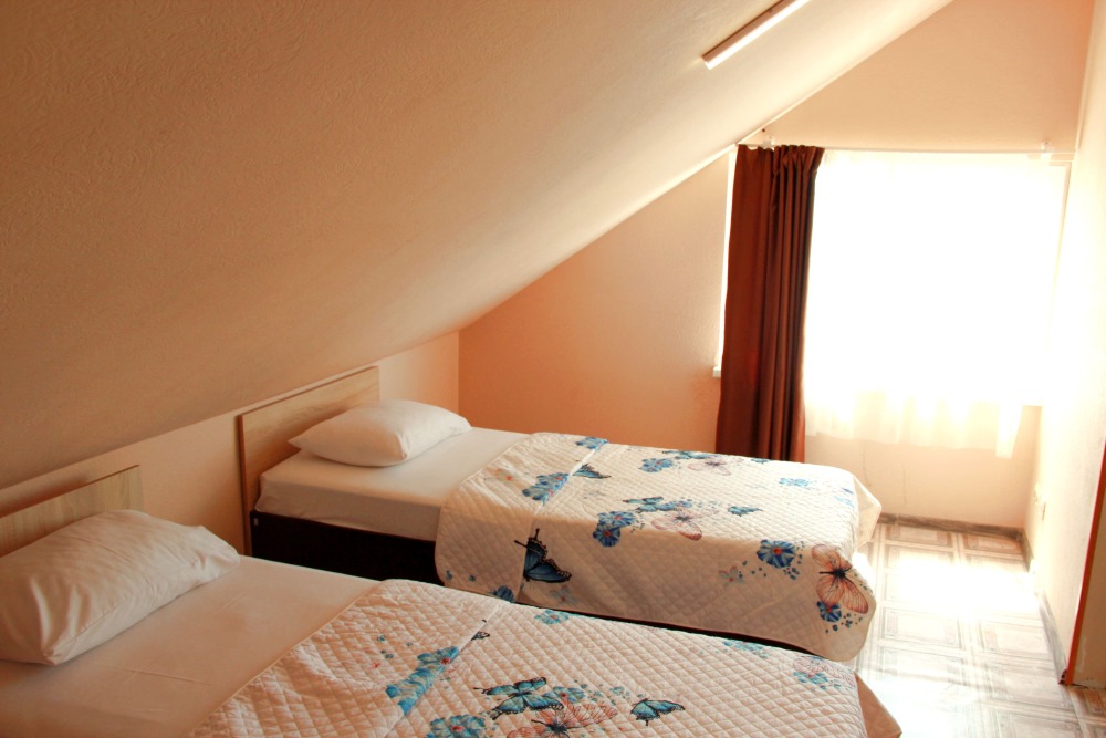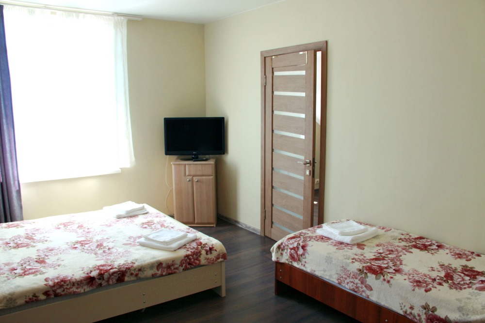 3-х местный номер категории «Стандарт» - отдельный вход с обратной стороны корпуса 2 - однокомнатный уютный номер, расположенный на 2 этаже гостевого дома, в номере 2-х спальная кровать и 1-но спальная кровать, шкаф для одежды, прикроватные тумбочки, телевизор, кондиционер. В номере есть большой балкон с видом на море и внутренний двор гостевого дома. На балконе есть стол и стулья для отдыха. Санузел (душ, туалет, умывальник) в номере.