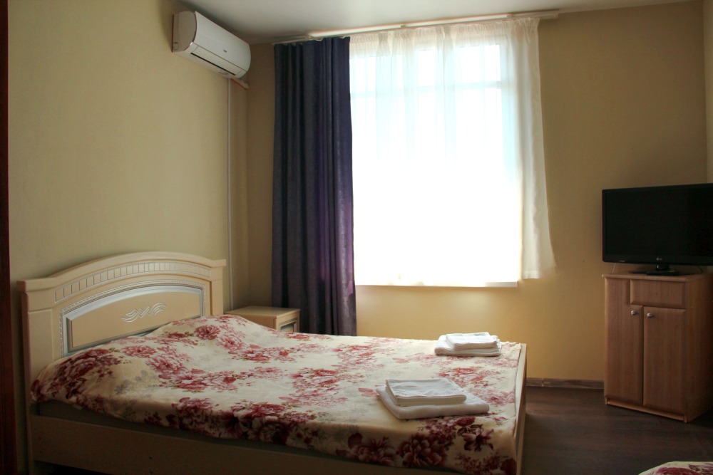 3-х местный номер категории «Стандарт» с балконом - однокомнатные уютные номера, расположенные на 2 этаже гостевого дома, в каждом номере 2-х спальная кровать+1-но спальная кровать, шкаф для одежды, прикроватные тумбочки, телевизор, мини-холодильник, кондиционер. Со всех номеров данной категории открывается потрясающий вид на море. Санузел (душ, туалет, умывальник) в номере. Гладильная доска на этаже рядом с номером. На балконе есть стол и стулья для отдыха.