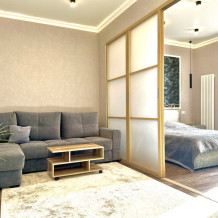 - В квартире есть все необходимое для комфортного проживания: полноценная кухня, ванная комната с душем, удобная гостиная зона и спальня, из окна открывается вид на город и его окрестности.
