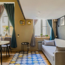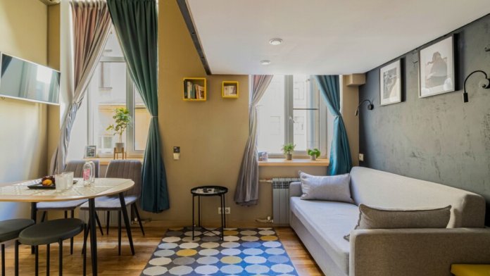 Использовано много деревянных элементов в том числе на полу паркетная доска на пробковом подкладе с целью дать возможность находящимся в квартире чувствовать себя максимально комфортно в центре города.