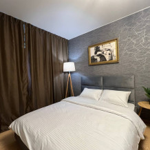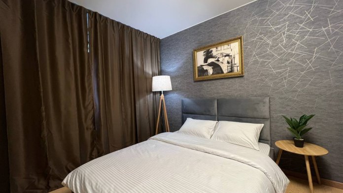 На кухне электрочайник, микроволновка, холодильник, духовой шкаф, электроплита. Приятное освещение. Есть телевизор. Кровать широкая, матрас удобный. Диван.
