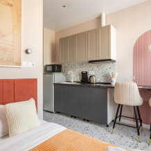 - Стильный кухонный гарнитур со всем необходимым для приготовления любимой домашней еды (техника, кухонные принадлежности, посуда, столовые приборы).