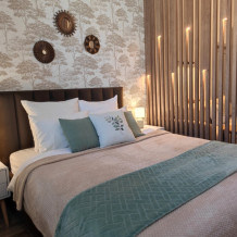 В квартире с комфортом разместятся 7 человек. В большой комнате 4 спальных места: 2-х спальная кровать и 2-х спальный раскладной диван. Маленькая комната — спальное место для 2-х человек на втором этаже, внизу - комфортный для ежедневного сна диван для 1 человека. Шторы в обеих комнатах с высокой степенью затемнения, что спасёт вас во время летних белых ночей.