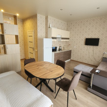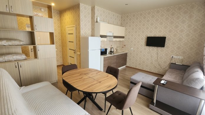 В квартире большая кровать, раскладной диван, кухня, санузел с душевой кабиной.