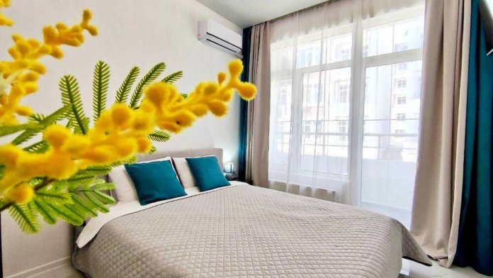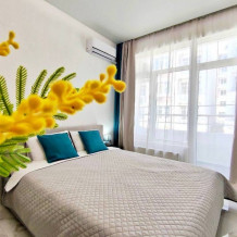 Внутри: двуспальная кровать, балкон, кухня с плитой, посудой, микроволновкой, стиралка, фен, утюг, ТВ и быстрый интернет, кондиционер.