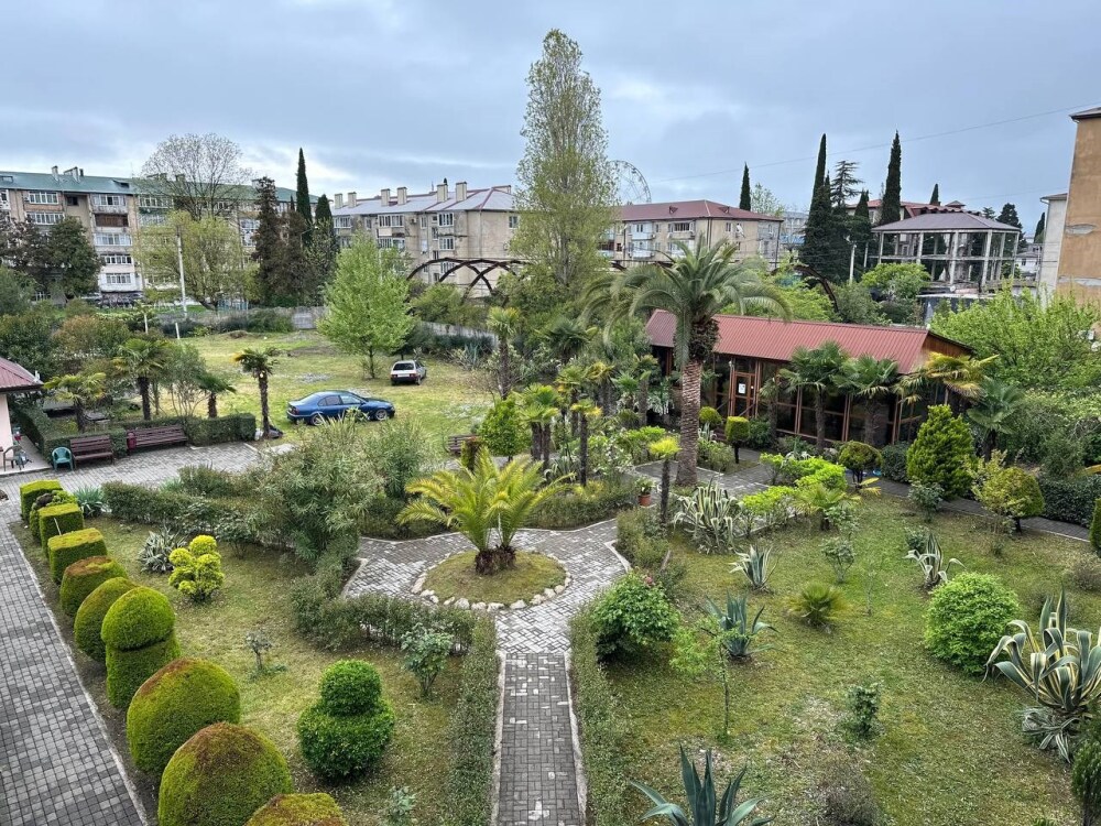 Уникальность расположения в том, что Красивый и всегда ухоженный двор отеля радует отдыхающих пышными зелеными пальмами, изобилием всевозможных цветов и экзотических южных растений, что способствует приятному отдыху на природе. На территории гостевого дома, в зоне отдыха, работает кафе-бар, где для отдыхающих ежедневно проходят завтраки, обеды и ужины.
