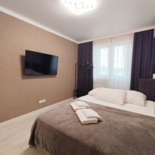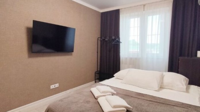 Комната: шкаф для одежды, двуспальная кровать (ширина 140 см), кресло-кровать, телевизор, сплит-система.