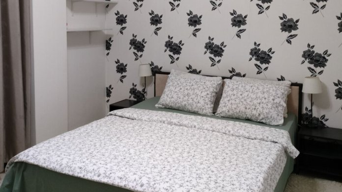 Спальня: большая двуспальная кровать (ширина 1,6 м), комод для вещей, телевизор, сплит-система, на полу теплый палас, чистое постельное бельё.