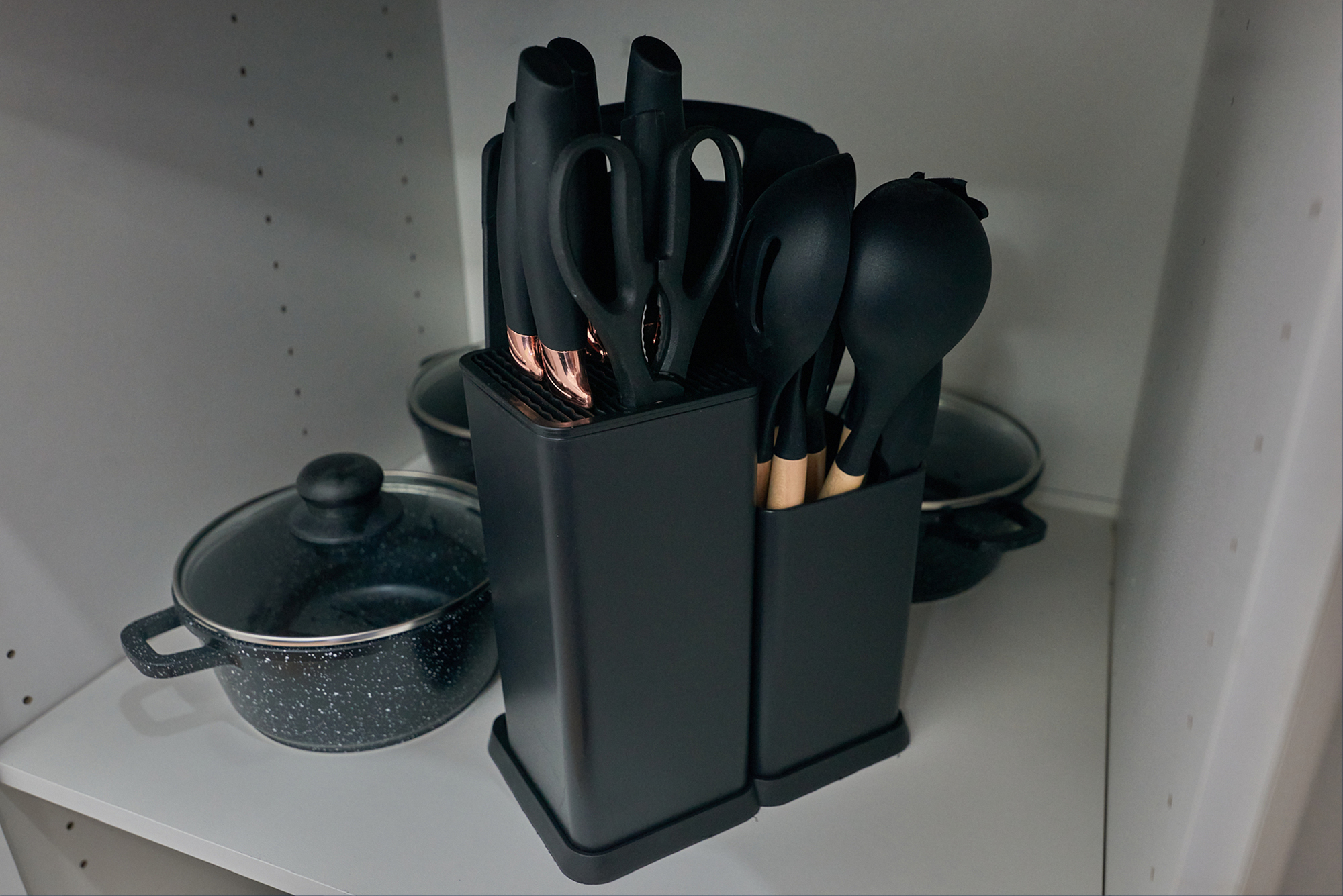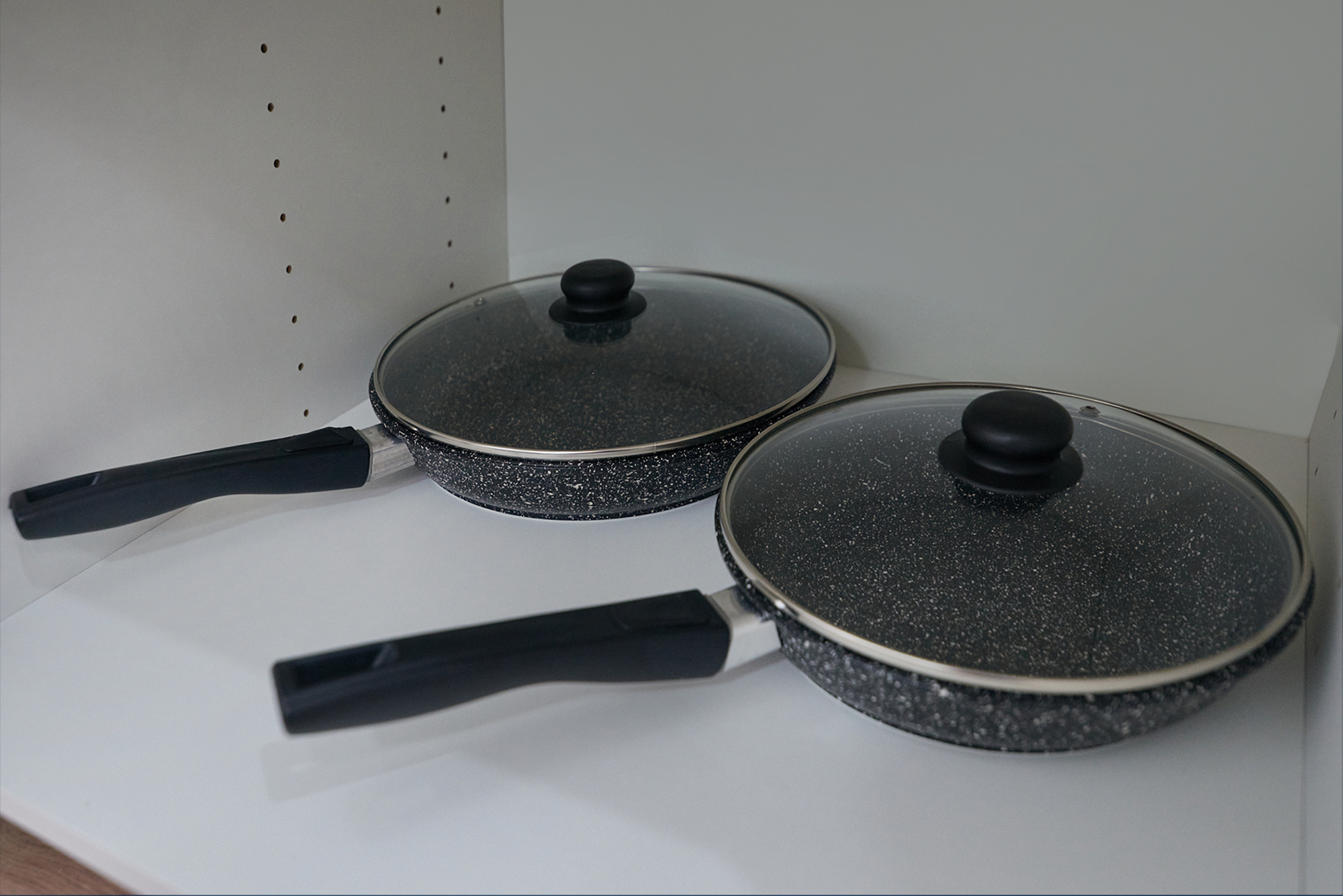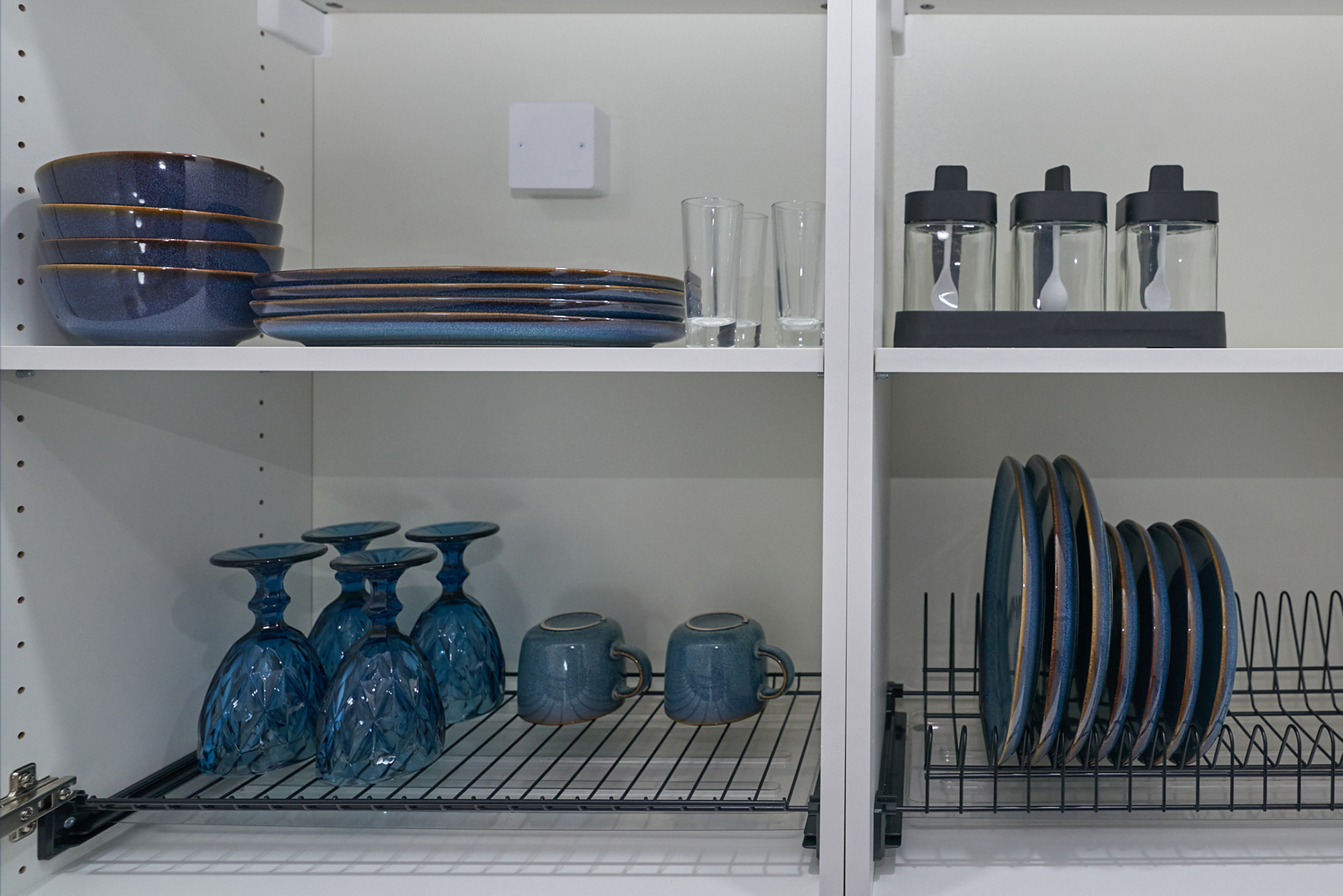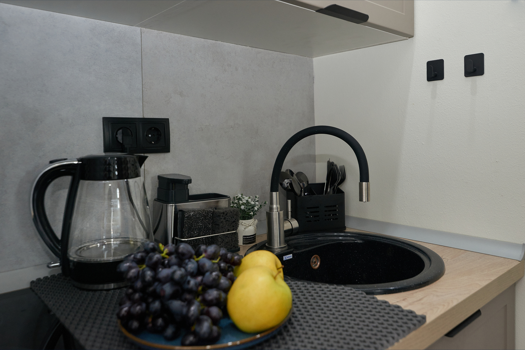 Полностью оборудованная кухонная зона (плита, чайник, посуда).