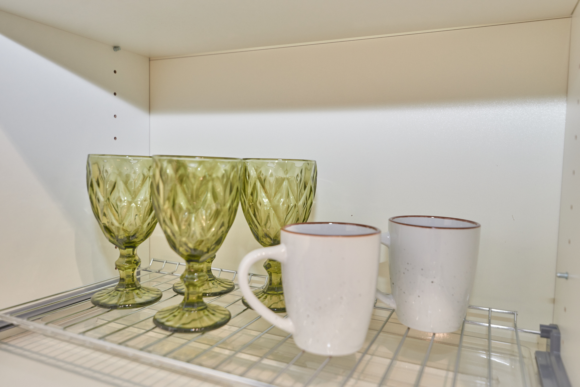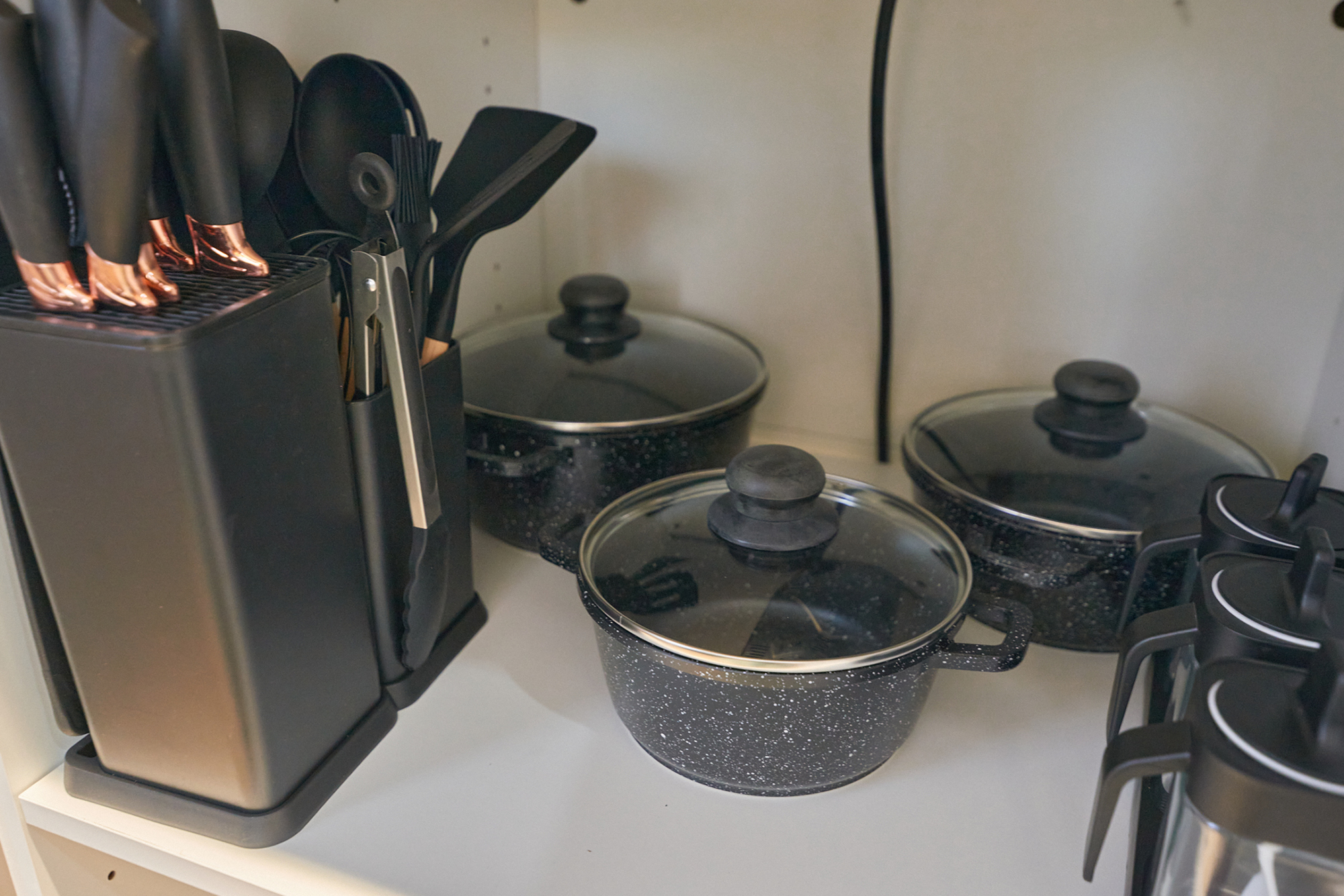 Полностью оборудованная кухонная зона (плита, чайник, посуда).