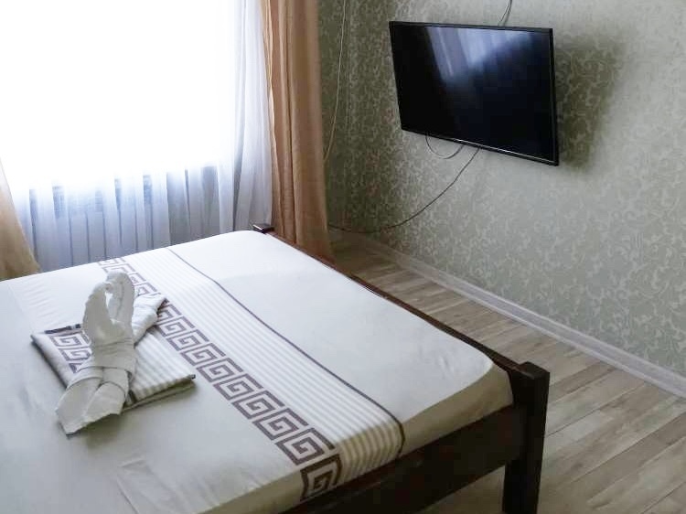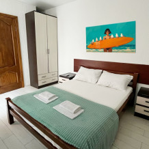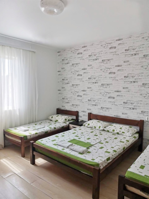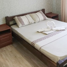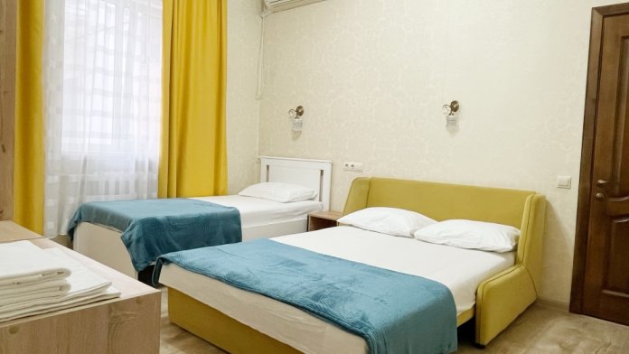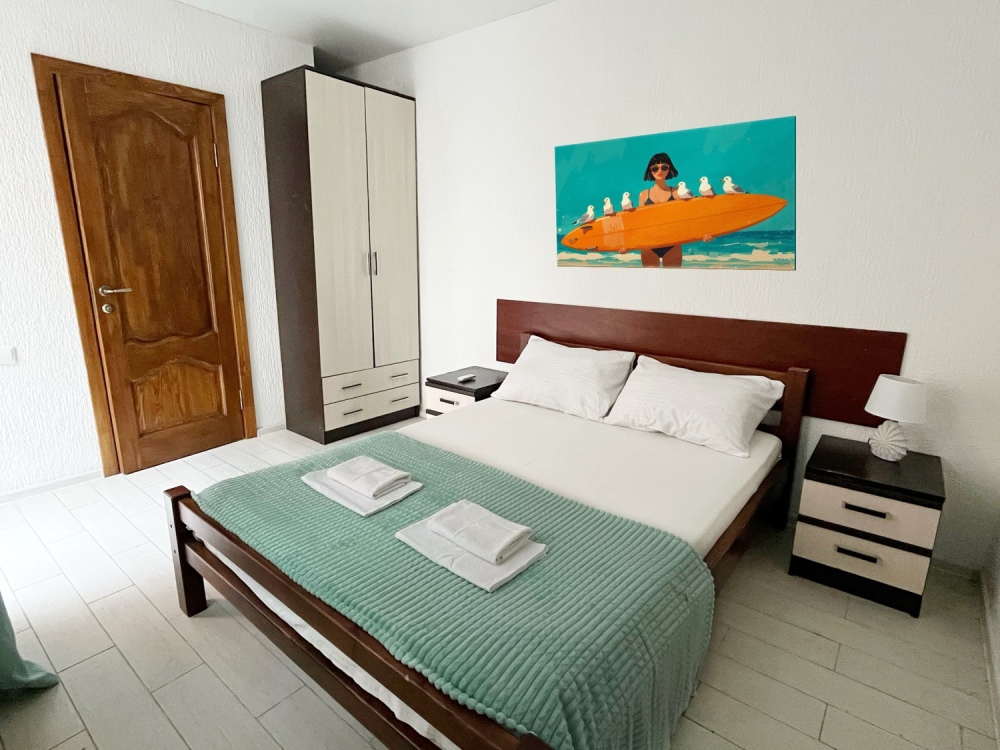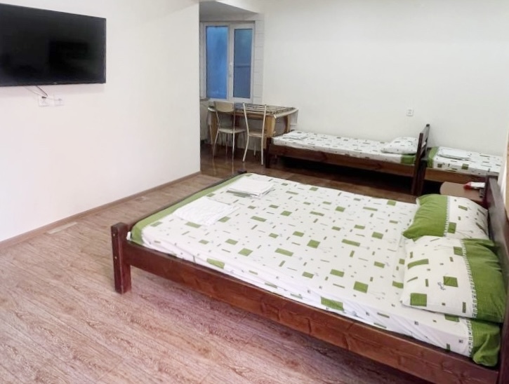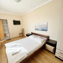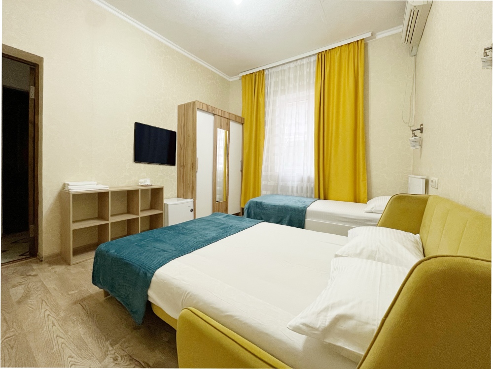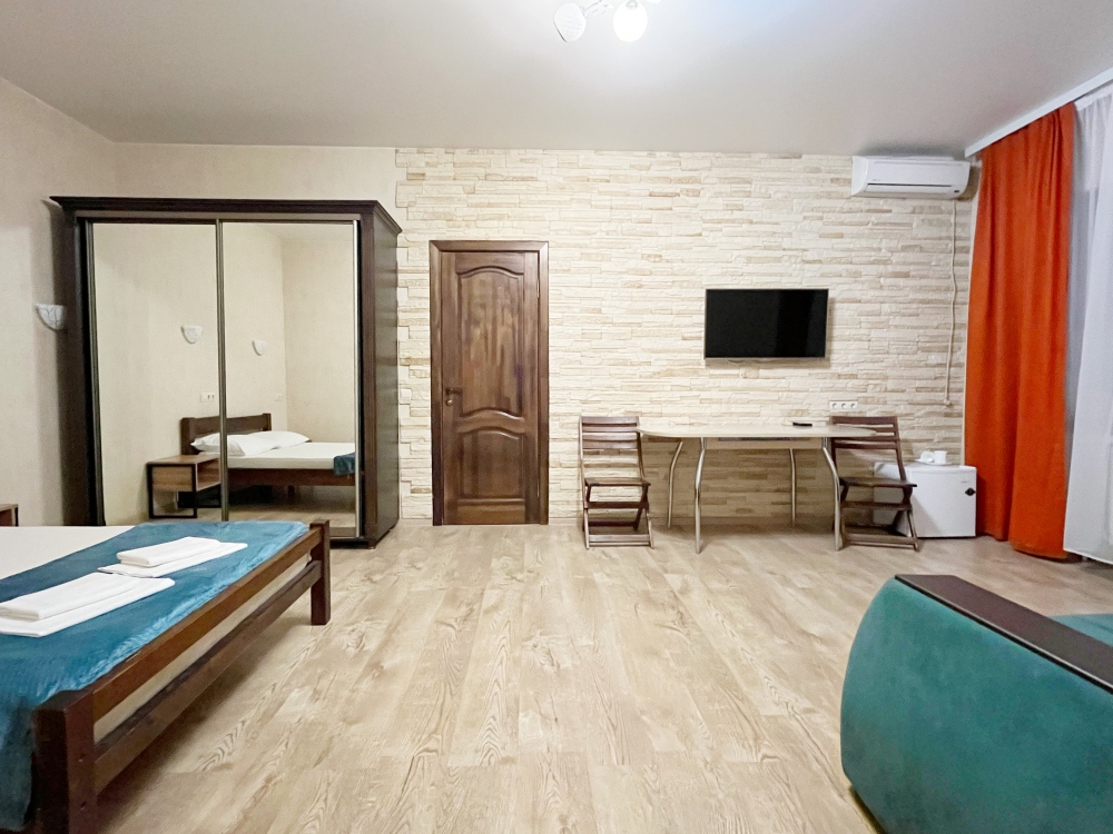 В номере имеется двуспальная кровать, комфортный диван-кровать с ортопедическим основанием на двоих, смарт-телевизор, небольшой холодильник, сплит. система, шкаф для одежды, тумбочки, стол, возможность поставить доп. место (ортопедическая раскладушка). Сан узел (душ, унитаз, раковина) в номере. На этаже находится общая кухня на 4 номера с обеденными зонами
