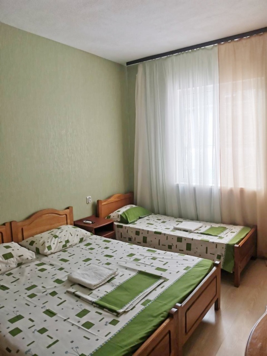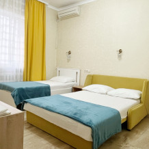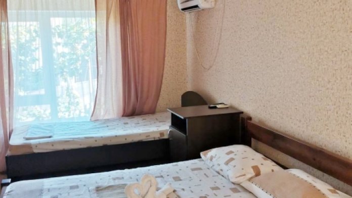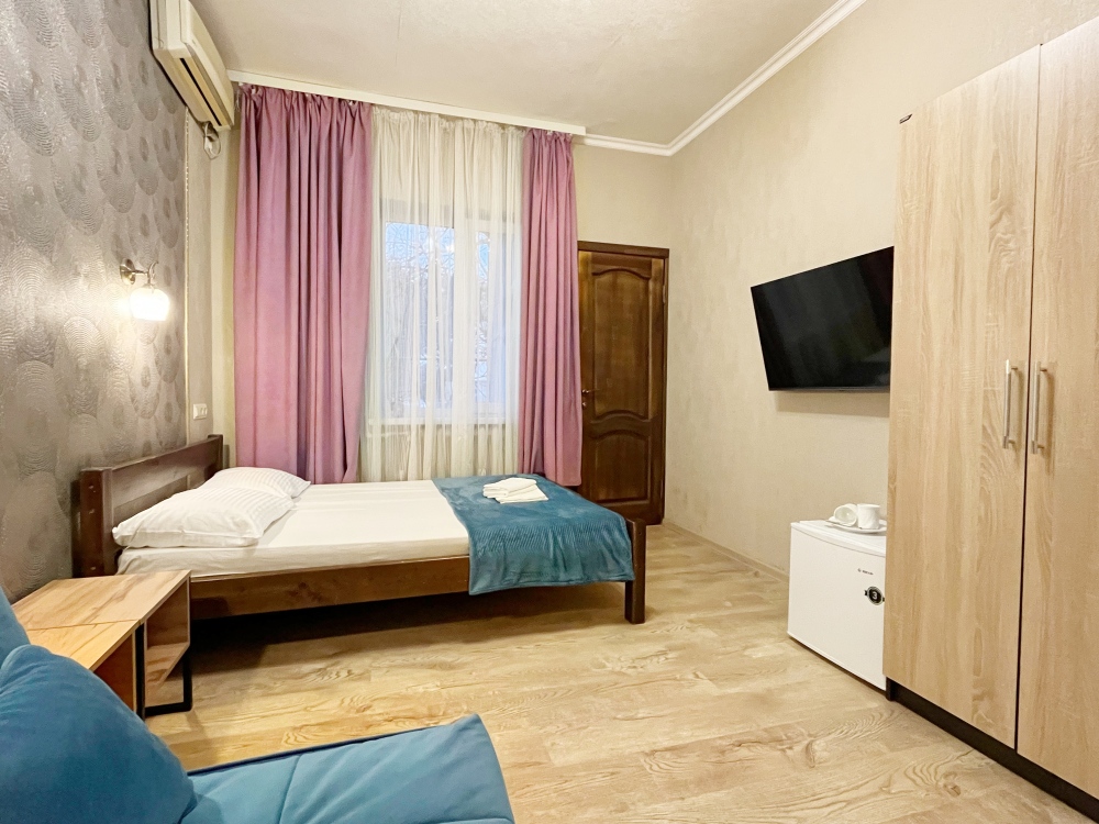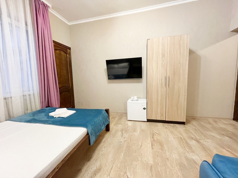 В номере имеется комфортный ортопедический диван-кровать (ширина 140см), односпальная кровать, смарт-телевизор, небольшой холодильник, сплит. система, шкаф для одежды, тумбочки. Сан узел (душ, унитаз, раковина) в номере.