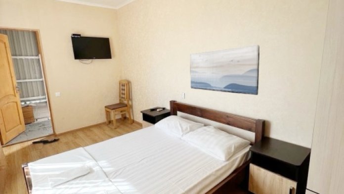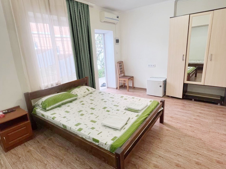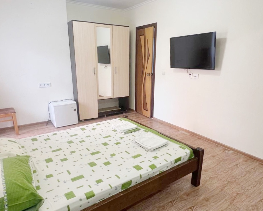 Номер находится на первом этаже гостевого дома. Номер на двоих гостей, имеются тумбочки, шкаф для одежды, компактный холодильник, сплит. система, смарт-телевизор. В номере сан. узел (душ, унитаз, раковина)