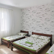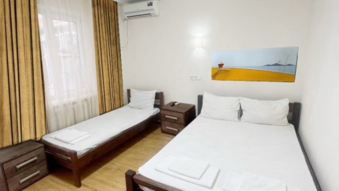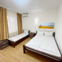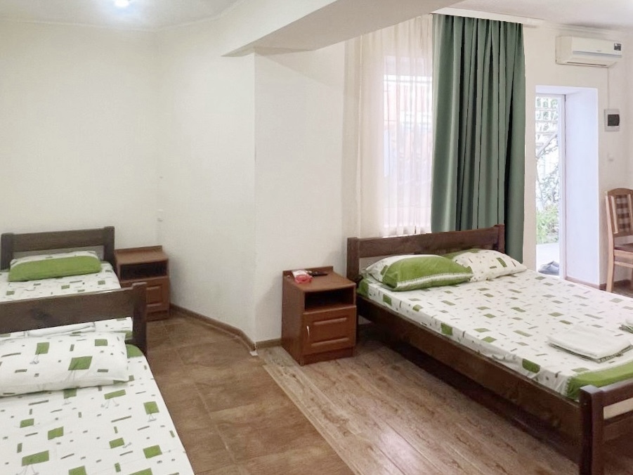 В номере имеется двуспальная кровать, две односпальные кровати, небольшой холодильник, сплит. система, шкаф для одежды, тумбочки.