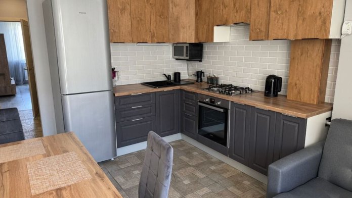 Кухня оснащена: варочной панелью, духовкой, СВЧ-печью, электрочайником, холодильником и посудомойкой. Чай и кофе всегда в наличии.