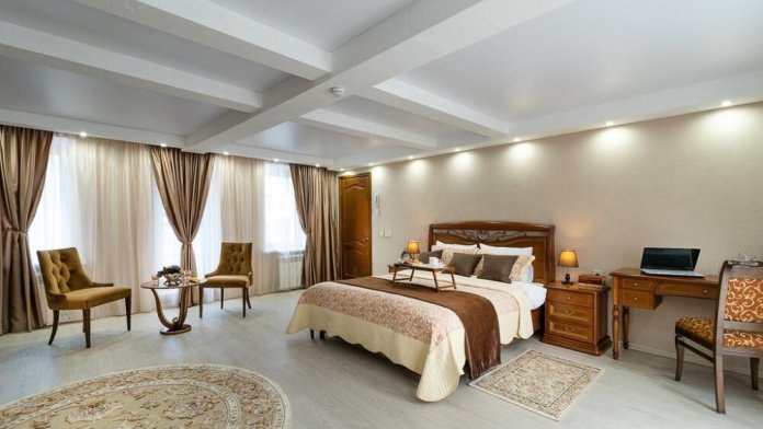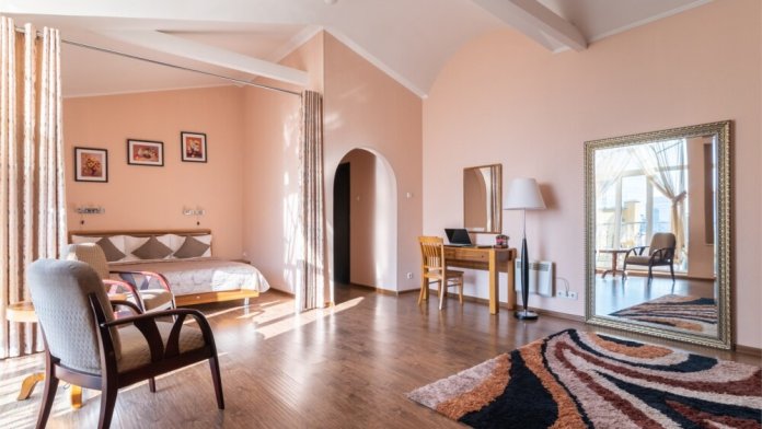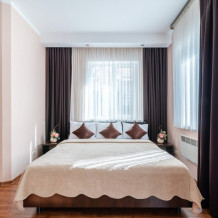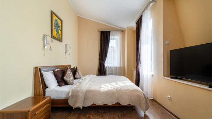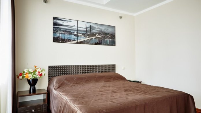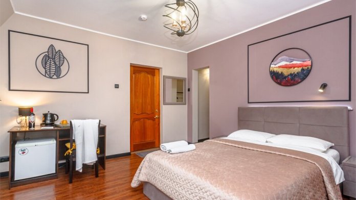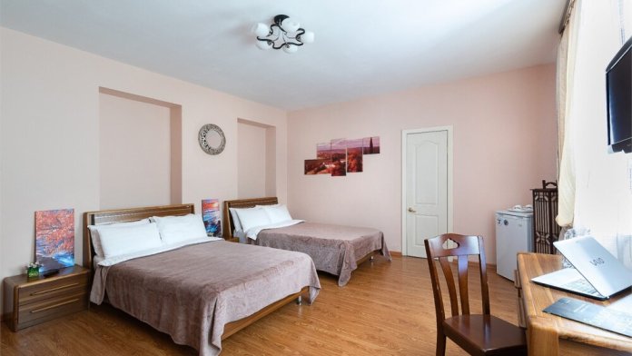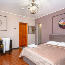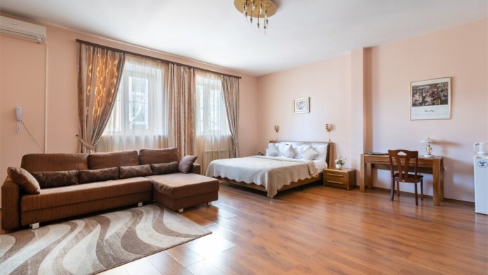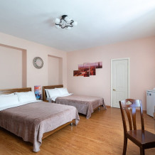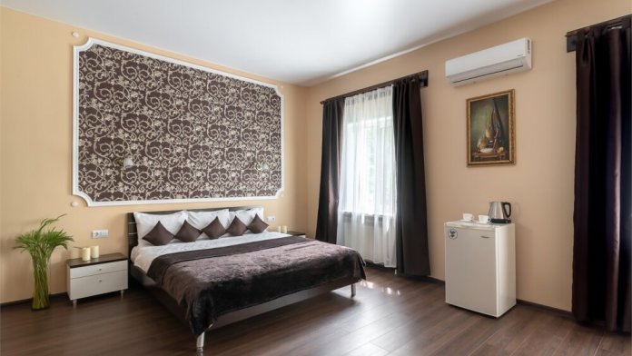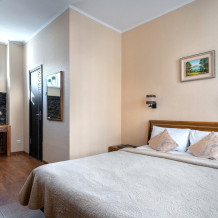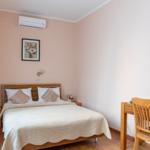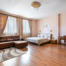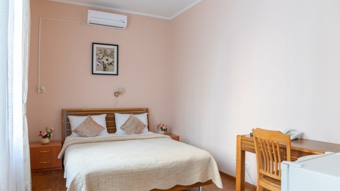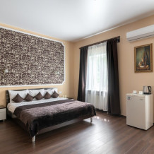 В номере Вы найдете все, что необходимо для полноценного отдыха: широкая двуспальная кровать, письменный стол, кондиционер, ЖК телевизор, телефон, Wi-Fi бесплатно, холодильник, эл. чайник, чайные приборы. В гостиной зоне: журнальный столик, мягкие кресла и диван - кровать. В ванной установлена современная душевая кабина, есть набор полотенец, тапочки и туалетные принадлежности. Один ребёнок до 6 лет — можно без отдельного спального места.