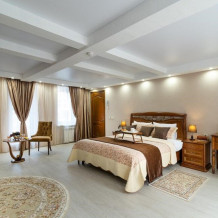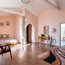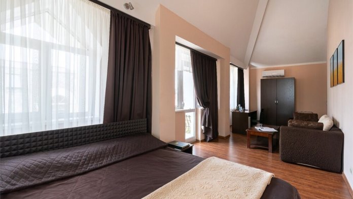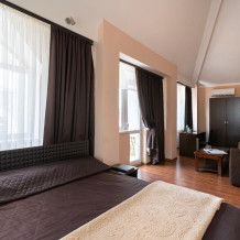 В номере Вы найдете все, что необходимо для полноценного отдыха: широкая двуспальная кровать, телефон, письменный стол, журнальный столик и мягкие кресла, диван - кровать, который позволяет организовать дополнительное спальное место, кондиционер, ЖК телевизор, Wi-Fi бесплатно, холодильник, эл. чайник, чайные приборы. Балкон. В ванной комнате установлена современная душевая кабина, есть набор полотенец, халат, тапочки и туалетные принадлежности. Есть фен и все, что нужно для того, чтобы привести себя в порядок.