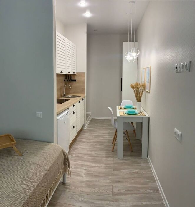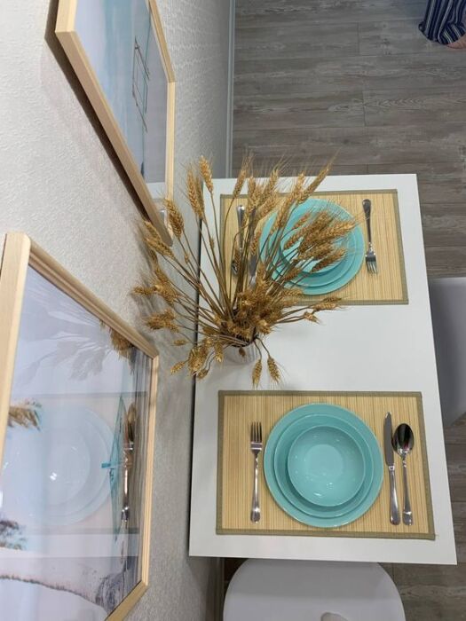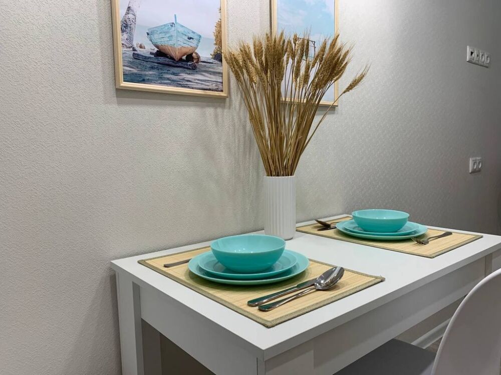 - Стильный кухонный гарнитур со всем необходимым для приготовления любимой домашней еды (техника, кухонные принадлежности, посуда, столовые приборы).