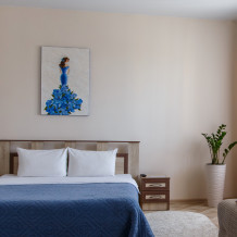 Oтличается особым теплом и уютом. Ее часто выбирают семьи с детьми. На полу пушистый ковер, интерьер в мягких оттенках цвета индиго, настоящая картина, написанная маслом, специально для этой квартиры, и очень точно передающая атмосферу пространства. Красивая посуда, духовка, гардеробная. Квартира с регулируемыми батареями – можно выставить комфортную температуру, есть «теплый пол». Светлая и солнечная, благодаря 2 окнам и лоджии.