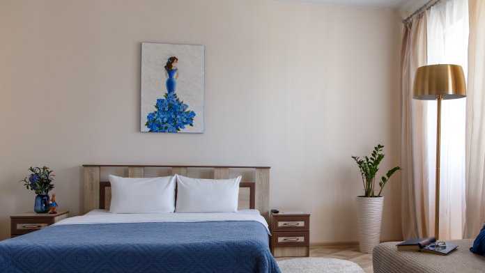 - Для комфортного сна: двуспальная кровать и двуспальный диван с качественными постельными принадлежностями и белоснежным бельем.