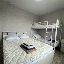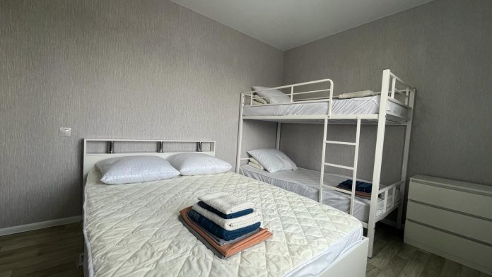 Квартира вмещает 4 гостя. Спальные места: одна двуспальная кровать и двухъярусная кровать. Возможно разместиться семье с детьми. Шторы блэкаут. На окнах затворы для безопасности детей. Во дворе современная детская площадка. Магазин и пиццерия.