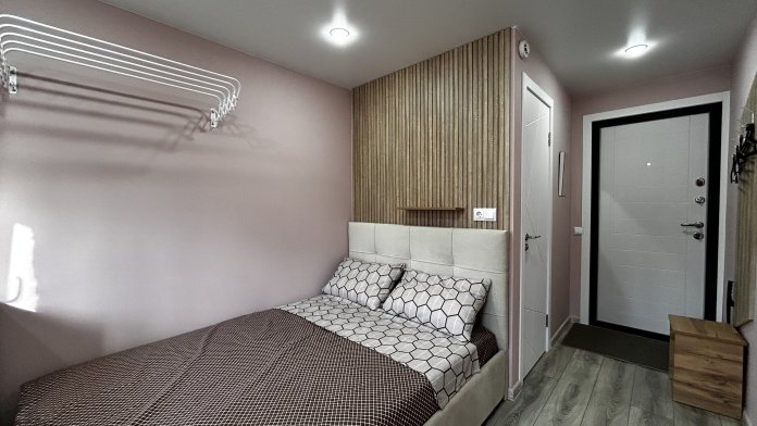 Для 2-х гостей - комфортная двуспальная кровать. В студии современный ремонт. Чистая, уютная. Есть все необходимое для комфортного проживания: высокоскоростной Wi-Fi интернет, техника: телевизор, фен, холодильник, микроволновая печь, эл.чайник, утюг, гладильная доска. Представляем поcтельнoe белье и полотенца.