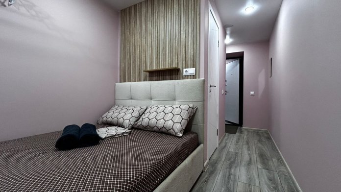 Для 2-х гостей - комфортная двуспальная кровать. В студии современный ремонт. Чистая, уютная. Есть все необходимое для комфортного проживания: высокоскоростной Wi-Fi интернет, техника: телевизор, фен, холодильник, микроволновая печь, эл.чайник, утюг, гладильная доска. Представляем поcтельнoe белье и полотенца.