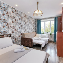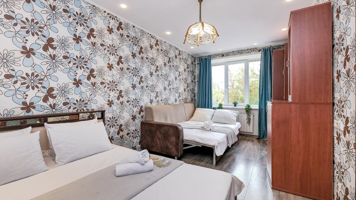 Квартира вмещает 4 гостя. Спальные места: одна двуспальная кровать и диван-кровать двухместный. Чистая, уютная. Есть все необходимое для комфортного проживания: высокоскоростной Wi-Fi интернет, техника: телевизор, фен, холодильник, микроволновая печь, эл.плита, эл.чайник, утюг, гладильная доска. Kухня оборудoвaна всем необxoдимым.