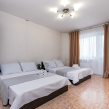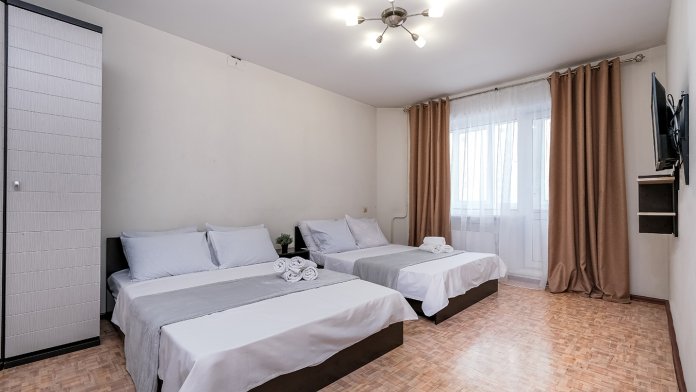 Квартира вмещает 4 гостя. Спальные места: две двуспальные кровати. Чистая, уютная квартира. Есть все необходимое для комфортного проживания: высокоскоростной Wi-Fi интернет, техника: телевизор, фен, холодильник, микроволновая печь, эл.плита, эл.чайник, утюг, гладильная доска. Kухня оборудoвaна всем необxoдимым.