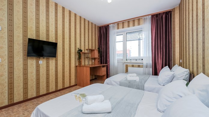 Квартира вмещает 10 гостей. Спальные места: 4 двуспальные кровати и двуспальный диван. В квартире есть все необходимое для комфортного проживания: высокоскоростной Wi-Fi интернет, техника: телевизор, фен, холодильник, микроволновая печь, эл.плита, эл.чайник, утюг, гладильная доска. Kухня оборудoвaна всем необxoдимым для большой компании.