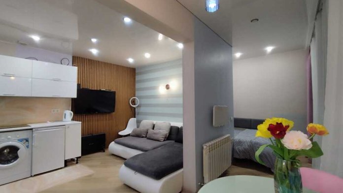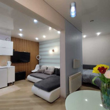 - полностью оборудованная кухня (посуда, микроволновка, холодильник, чайник);