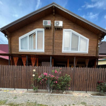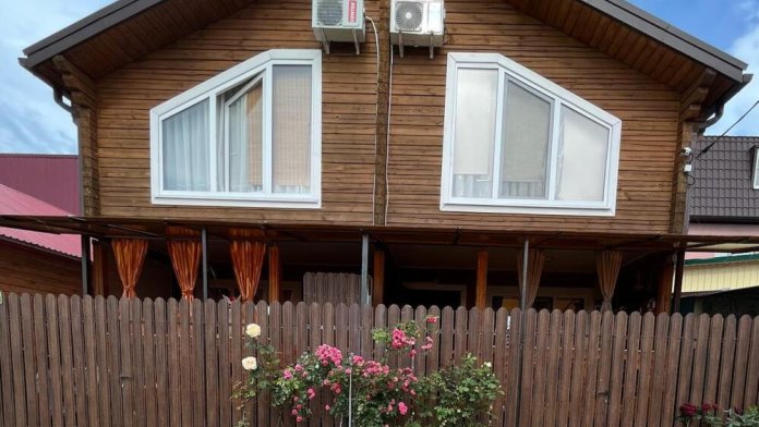 Деревянный дом разделен на три части (дуплекс). В одной из частей проживает хозяин. Дуплекс двухуровневый, отдельный вход, все удобства, веранда со столиком.