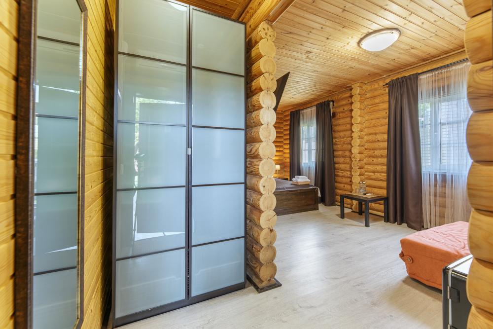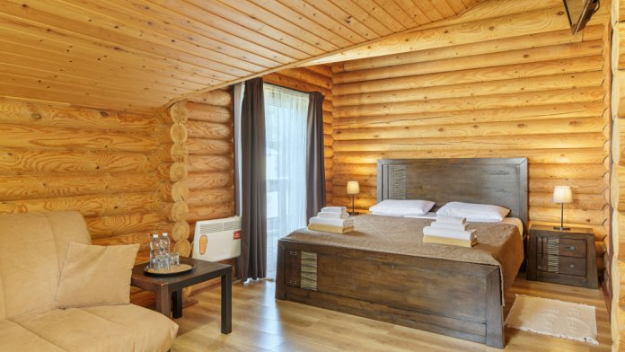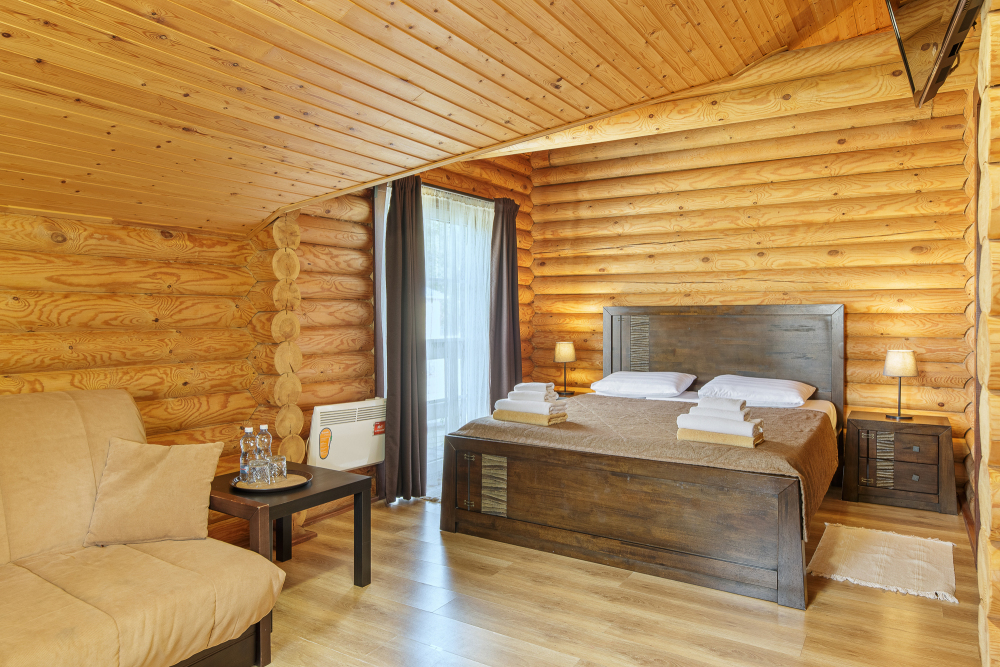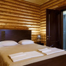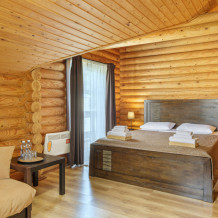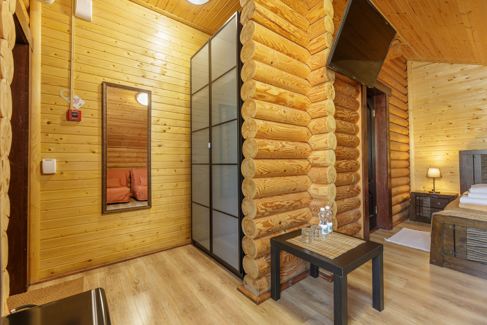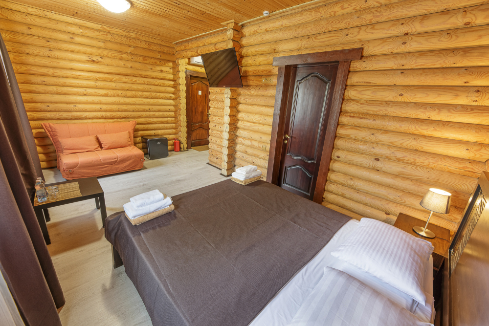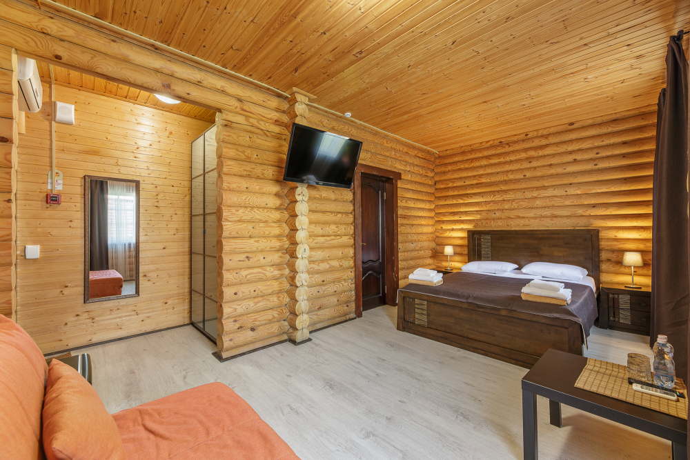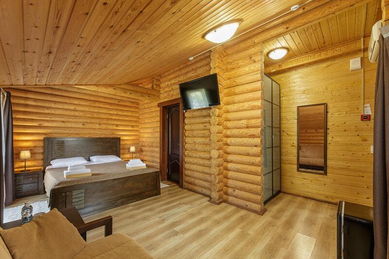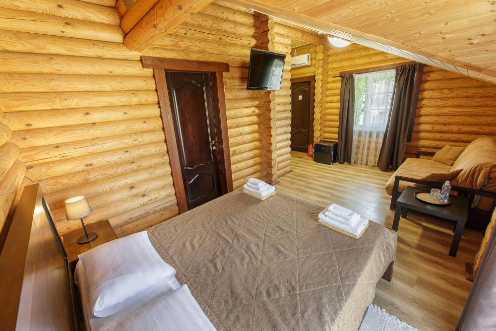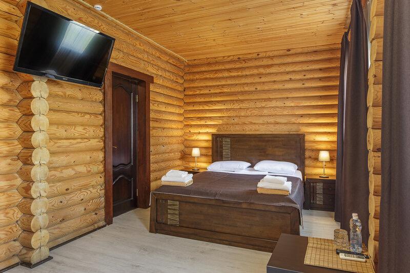 Наши коттеджи выполнены из натурального бруса и номера наполнены прекрасным ароматом дерева. Для гостей в номере есть все необходимое: телевизор с плоским экраном, холодильник, диван, журнальный столик, большая двуспальная кровать с ортопедическим матрацем. В номере для гостей имеется душевая кабина, фен, набор индивидуальных принадлежностей. Также предоставляется фен, набор полотенец и гигиенических принадлежностей (шампунь, мыло, гели, тапочки), питьевая бутилированная вода. Для поддержания комфортной температуры номера оборудованы кондиционерами, а за безопасность отвечают электронные замки.
