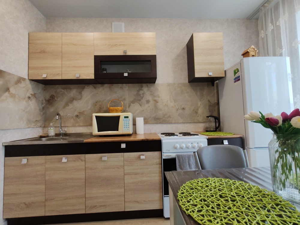 - Кухонный гарнитур с набором необходимой посуды, холодильник, микроволновая печь, чайник, электрическая плита, чай, кофе, сахар, соль.