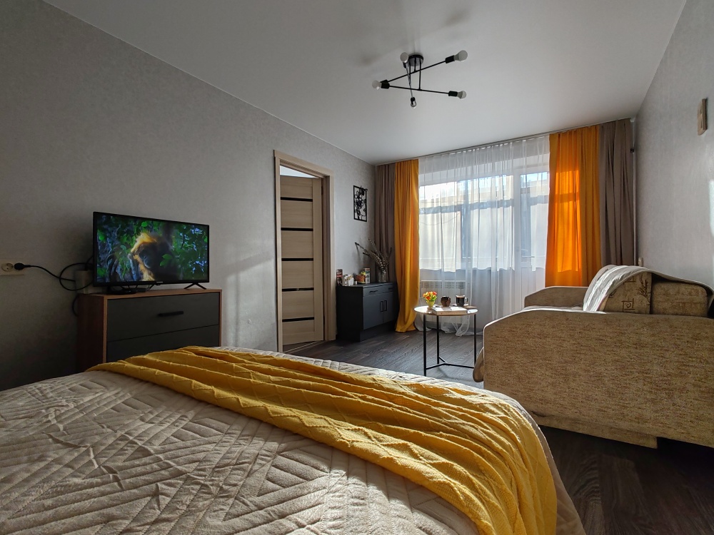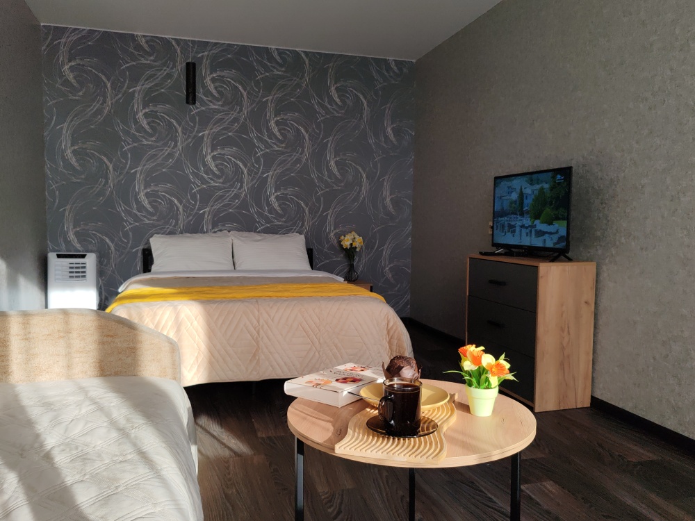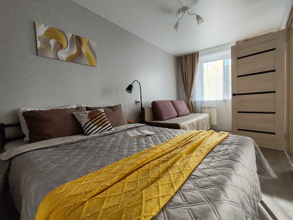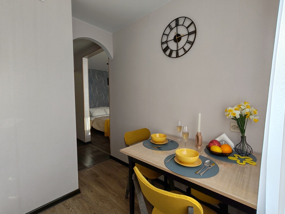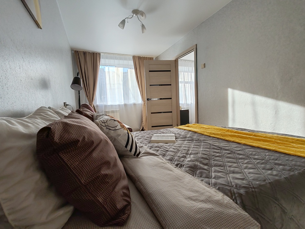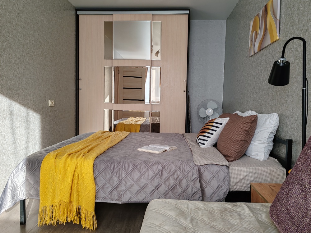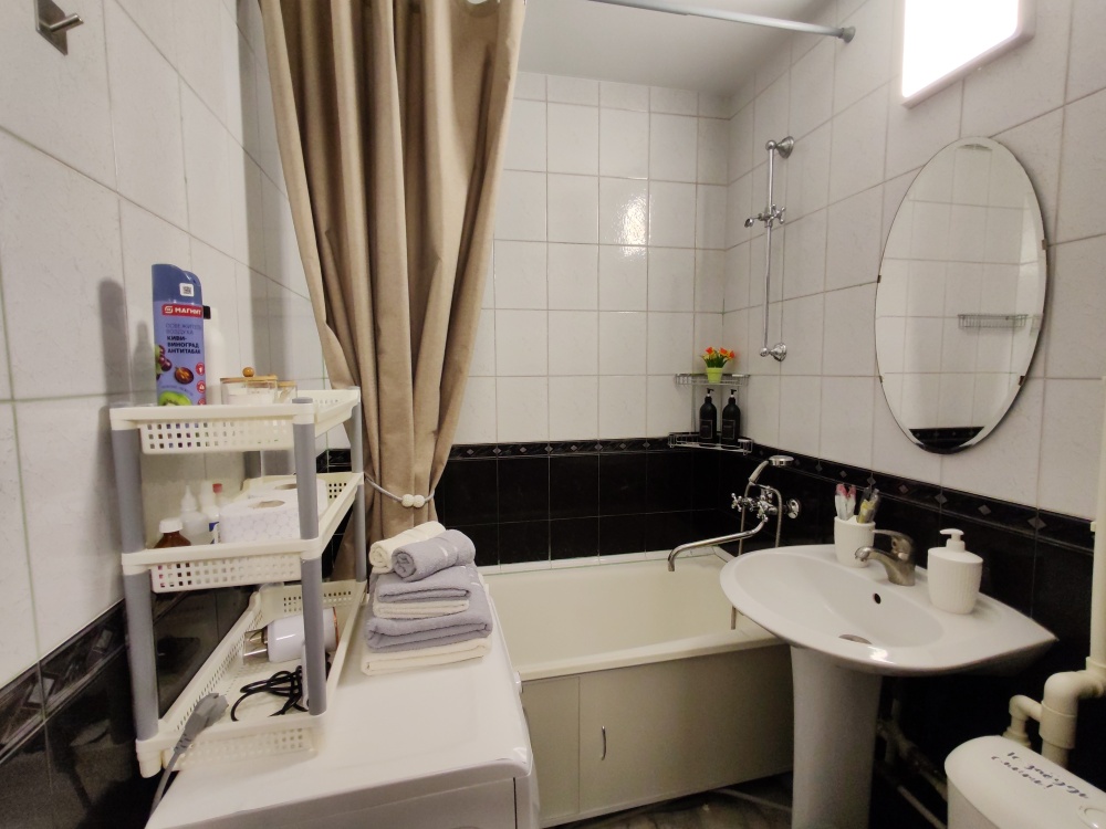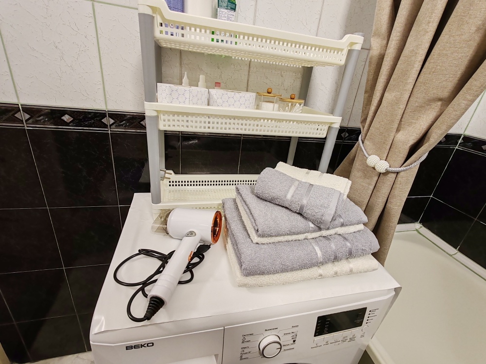 В квартире есть всё необходимое для гостей: 2 дивана двуспальные, 2 двухспальные кровати, 4 табуретки, 3 стула, стол кухонный, посуда, столовые приборы, штопор, холодильник, постельное белье, полотенца, комплект на каждого гостя, зубная паста, одноразовые щетки, гигиенические средства, подушки, одеяла, пледы, телевизор, утюг, гладильная доска, сушилка для белья, стиральная машина, фен.