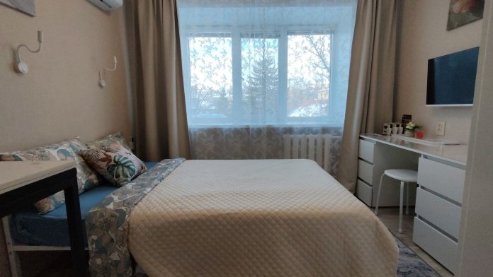 У нас Вы найдете все необходимое для комфортного проживания. В квартире есть 2-х спальная кровать 140/200, стол, стул, стиральная машинка, всегда горячая вода, т.к. есть водонагреватель, телевизор Smart-Tv и 200бесплатных каналов, Wi-Fi бесплатно доя гостей. На кухне чайник, фильтр для воды, плитка электрическая, холодильник, столовые приборы и посуда. А также чистые полотенца и постельное белье.