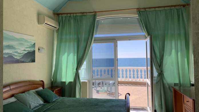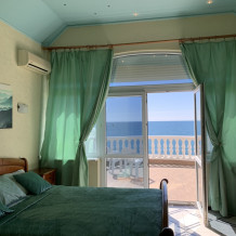 В коттедже 4 спальни с санузлами, в каждой 2-спальная кровать, максимально 10 человек. На первом этаже терраса с мангальной зоной, кухня, выходом на солярий. Парковка. Шикарный вид на море с двух балконов.