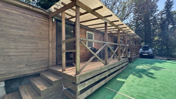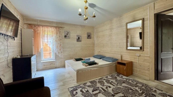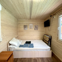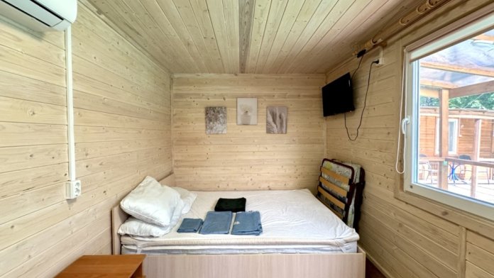 На территории базы отдыха имеются 2-местные, 3-местные и 4-местные деревянные домики, со всеми удобствами. В каждом домике есть 2-местная кровать, в 3-местных дополнительно 1-местная кровать, в 4-местном дополнительно раскладной диван-кровать. Мини-кухня в каждом домике: микроволновая печь, чайник, холодильник. Также имеется: телевизор, веранда с мебелью: обеденный стол и стулья, отдельный санузел с душевой, кондиционер, принадлежности для душа, полотенца и постельное белье, окно.