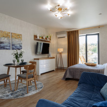 В квартире полноценная спальня и кухня-гостинная, у нас с комфортом можно разместиться 2 взрослым или семье с 2 детьми.